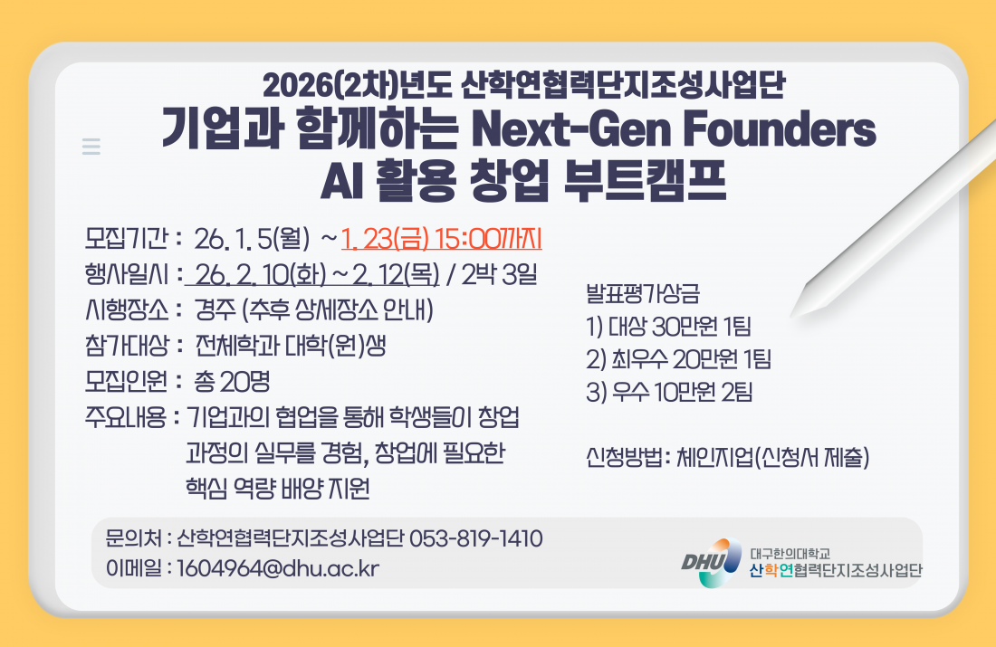 [산학연협력단지조성사업단] 2026(2차)년도 기업과 함께하는 Next-Gen Founders AI 활용 창업 부트캠프