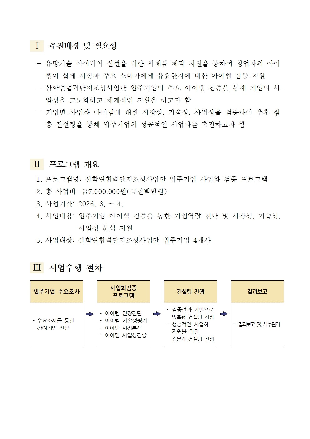2026(2차)년도 산학연협력단지조성사업단 사업화 검증 프로그램 운영(입주기업 아이템 검증 보고서 지원) 관리자2026-03-18조회 54 첨부파일 사업화 검증 프로그램 신청서(양식).hwp (109.5 KB) 이전글 2026(2차)년도 산학연협력단지조성사업단 Grow-up 인증지원(지식재산권 출원 지원) 프로그램 안내 다음글 2026(2차)년도 산학연협력단지조성사업단 THE PLUS Village 입주기업 팝업스토어 신선한 아이디어를 쇼핑하다 운영 안내 목록보기