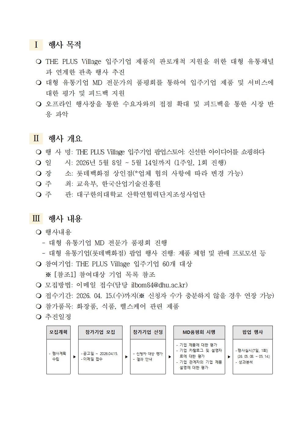 2026(2차)년도 산학연협력단지조성사업단 THE PLUS Village 입주기업 팝업스토어 신선한 아이디어를 쇼핑하다 운영 안내 관리자2026-03-30조회 58 첨부파일 붙임1. THE PLUS Village 입주기업 팝업스토어 신선한 아이디어를 쇼핑하다 참여신청서(양식).hwp (68.0 KB) 이전글 2026(2차)년도 산학연협력단지조성사업단 사업화 검증 프로그램 운영(입주기업 아이템 검증 보고서 지원) 다음글 다음글이 없습니다. 목록보기